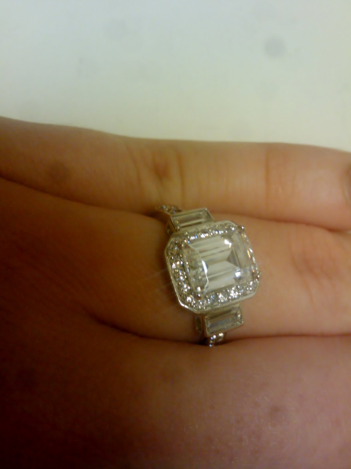 well heres the ring! its really hard to see and get a good look. its a white gold ring with 1.5 ct. true emerald cut diamond center stone with a diamond frame around it. a bagget diamond on each side and then a diamond band. its not the original one that we had purchased but the original one had a flaw that i just couldnt stop obsessing about so we returned it to find out it was no longer made. so we got this one and i love it even more. i love the true emerald cuts. they dont have very many facets (sp?) so they dont sparkle as much but they have a very vintage feel to them which suits my personality perfectly!